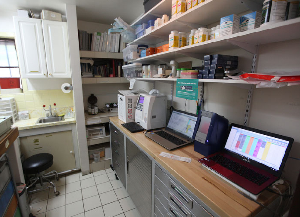 Off to one corner of this area is our anesthesia and dental area. If your pet needs surgery or dental work requiring anesthesia, this is where they are prepared. All of our pet dental cleaning is done in this area, but it has many other uses as well. Minor lacerations are repaired here, blood samples are taken, and emergency exams can be given if all the other exam rooms are full with guests.